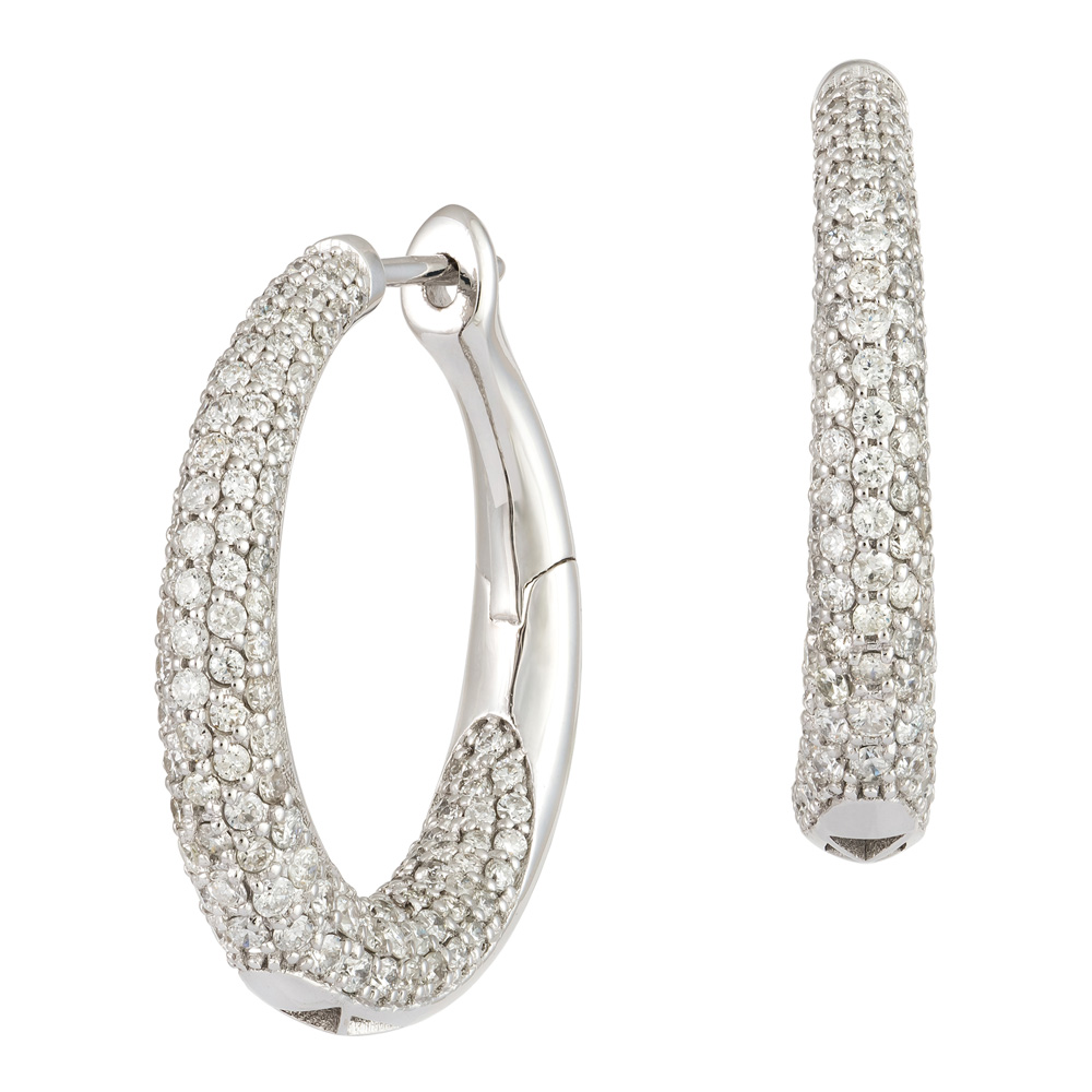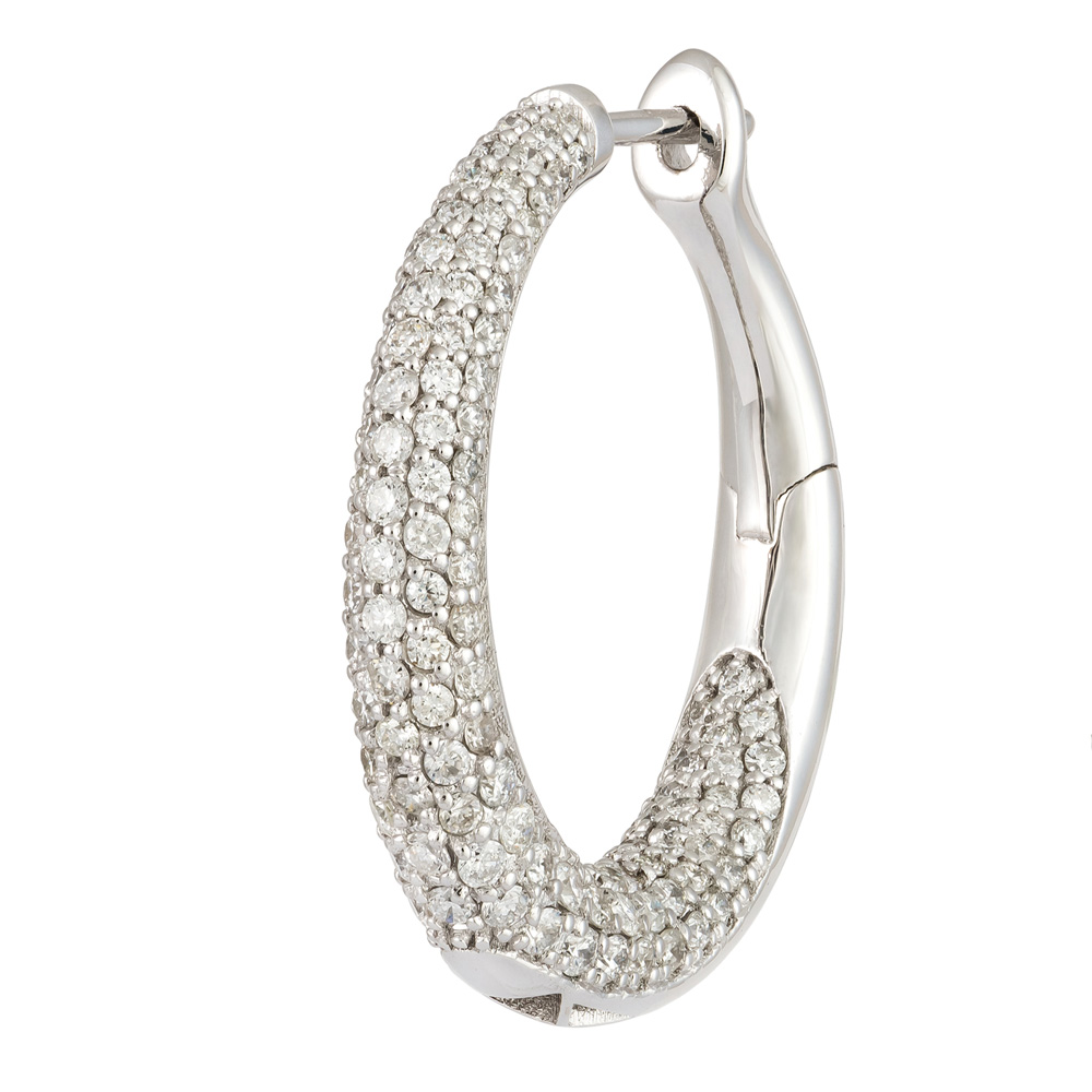 Cu un design atemporal, perechea de cercei creole realizata din aur alb 18K, pavati cu 306 diamante naturale in taietura briliant, cu un carataj total de 2,42 ct, avand sistemul de inchidere tip creole sunt accesoriul ideal in orice moment al zilei.