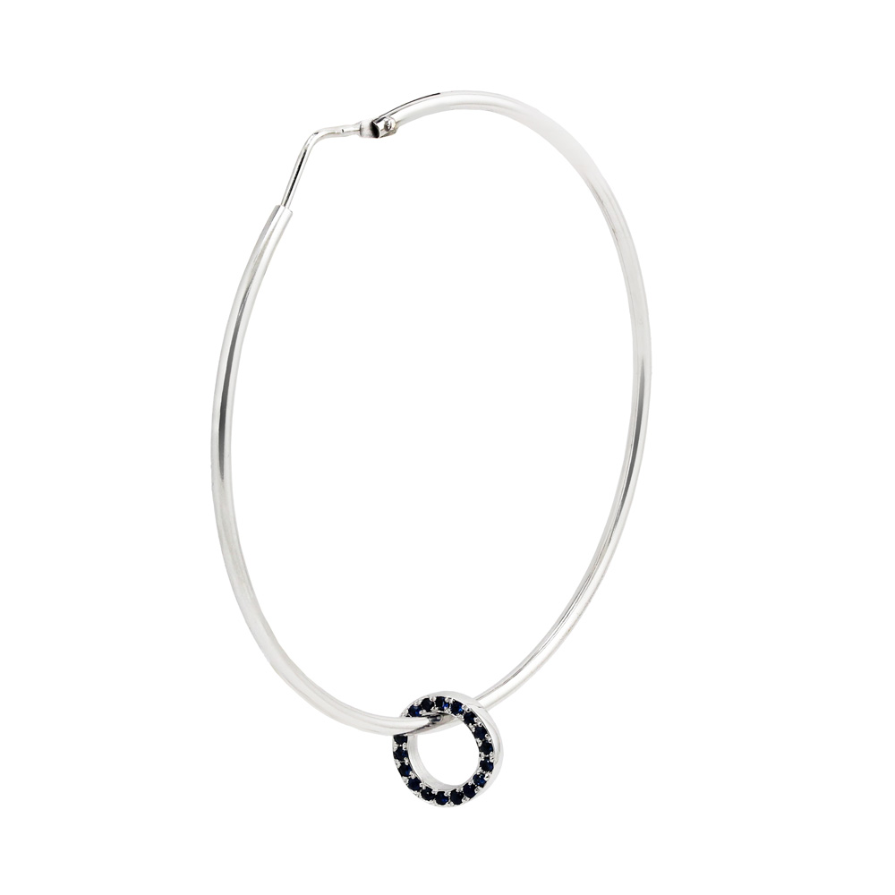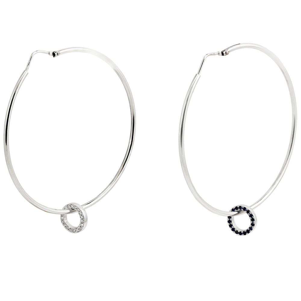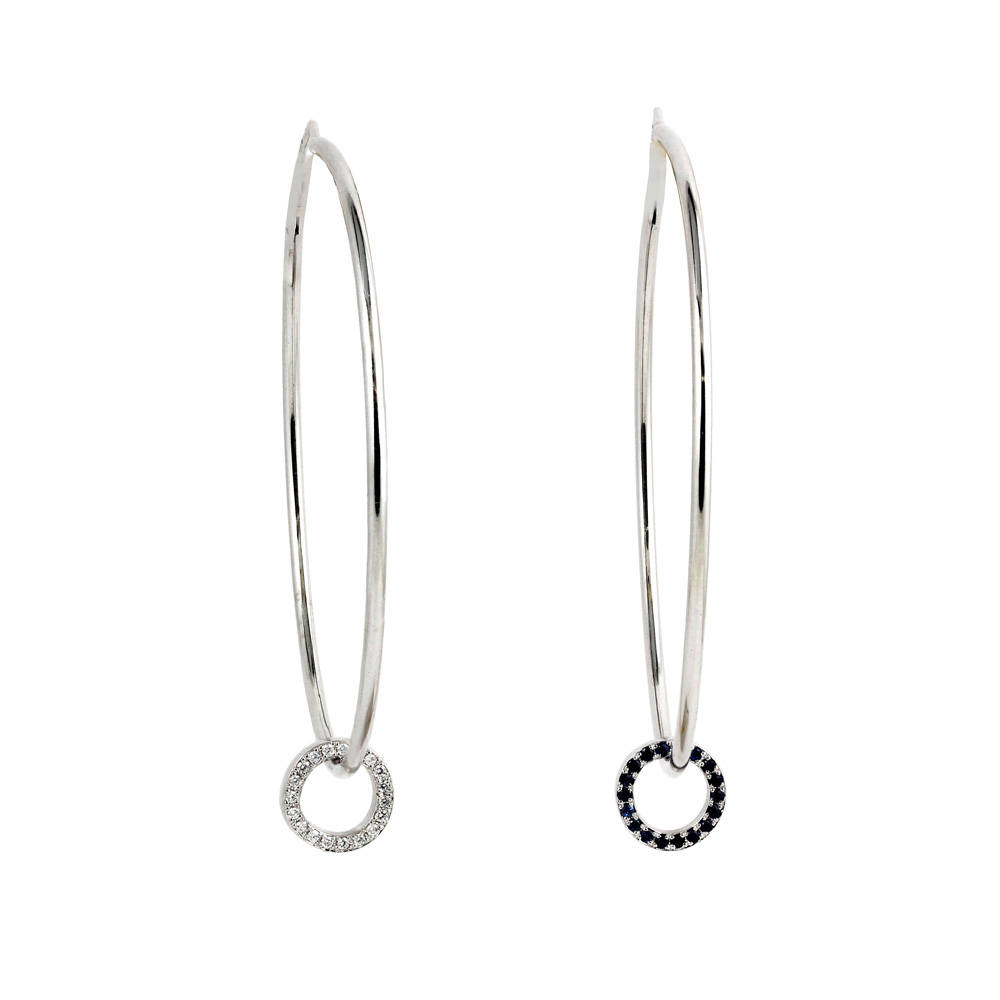 Cercei rotunzi, tip creole, cu o forma perfect circulara, ce accentueaza in mod exotic idea de cercei. Sunt realizati din aur alb 18K, avand pe fiecare creola cate o piesa mobila in forma de cerc, cu dubla fata insa, iar fiecare parte este tintuita, pe una din ele cu diamante albe, iar pe cealalta parte cu safire.