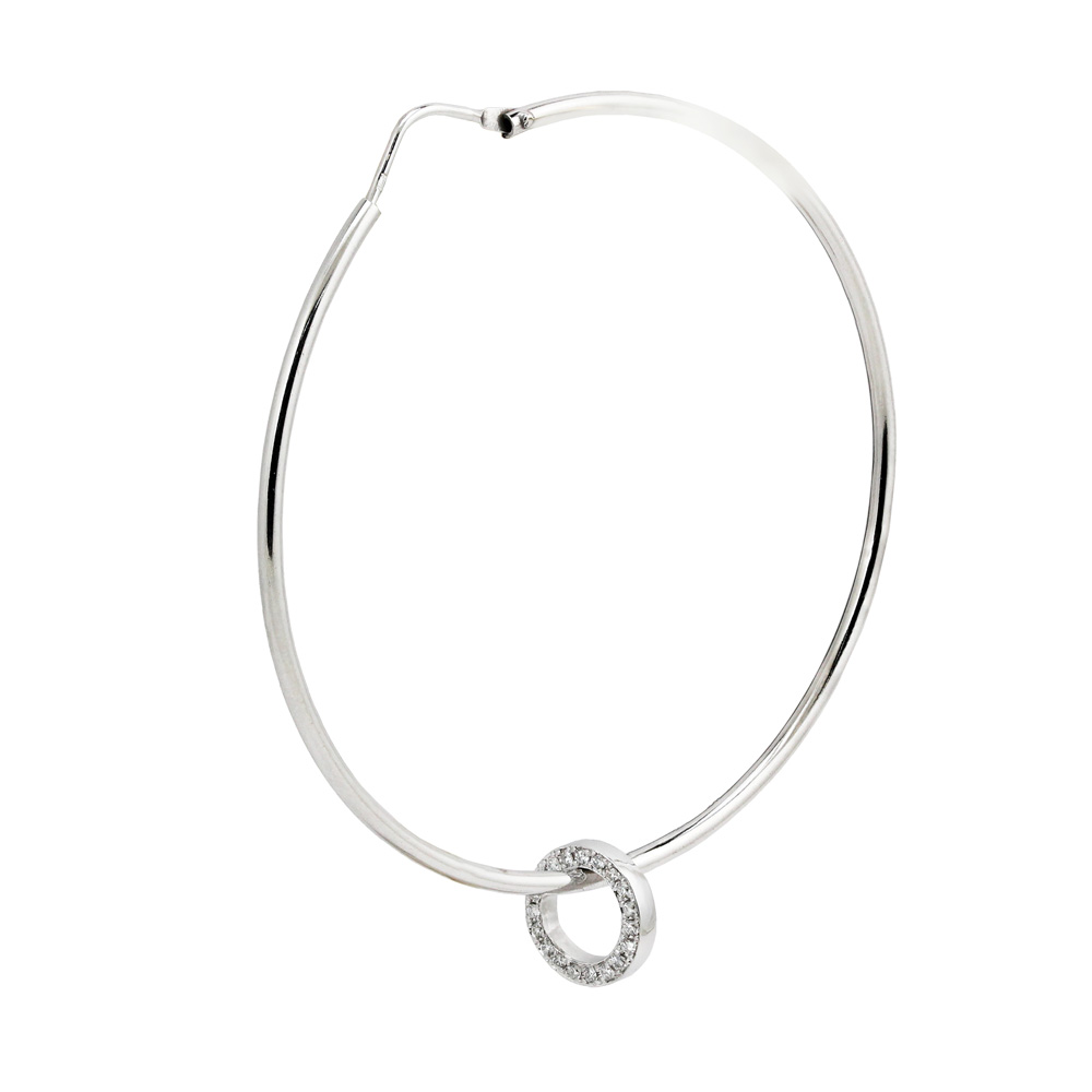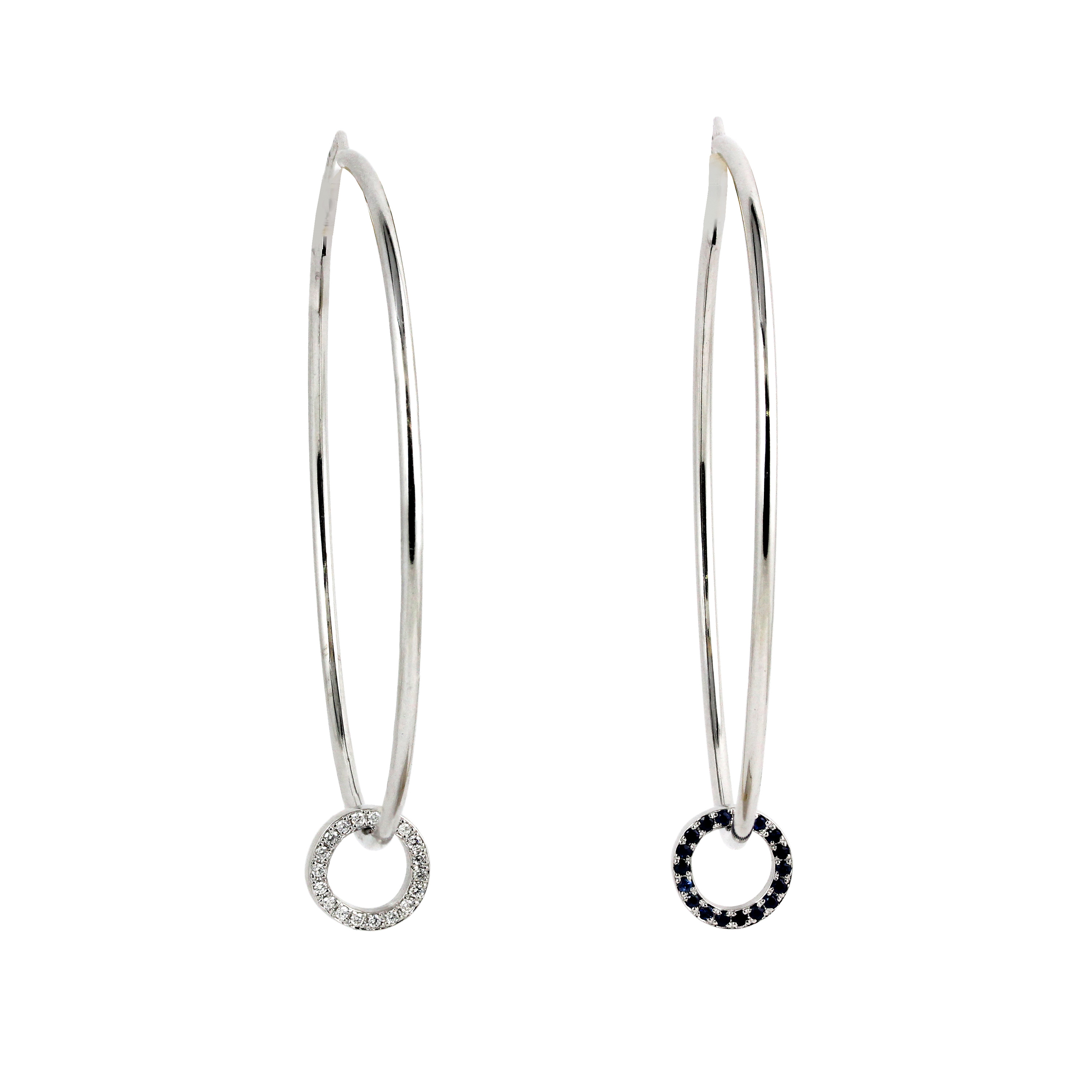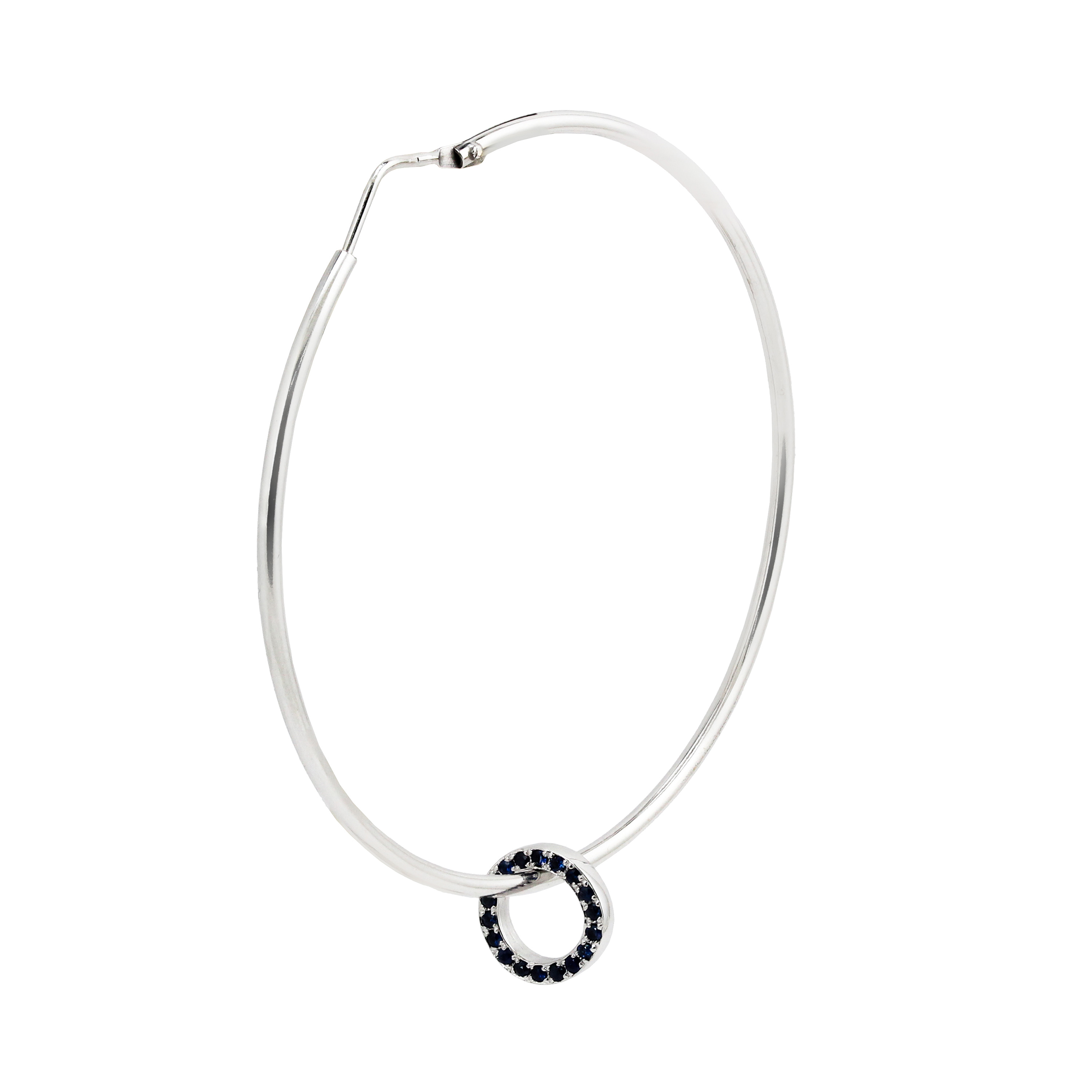 Cercei rotunzi, tip creole, cu o forma perfect circulara, ce accentueaza in mod exotic idea de cercei. Sunt realizati din aur alb 18K, avand pe fiecare creola cate o piesa mobila in forma de cerc, cu dubla fata insa, iar fiecare parte este tintuita, pe una din ele cu diamante albe, iar pe cealalta parte cu safire.