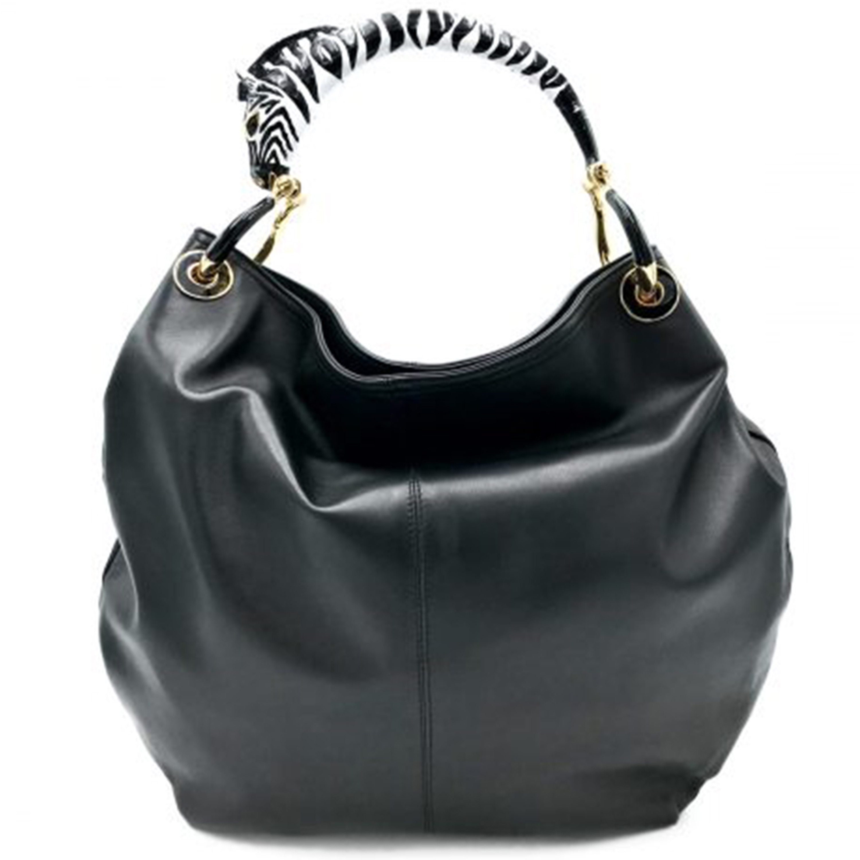 Geanta din piele naturala neteda, cu maner in forma de zebra, manerul fiind din alama placata cu aur de 24K, pictata manual cu email. Inchiderea se face printr-o capsa magnetica.